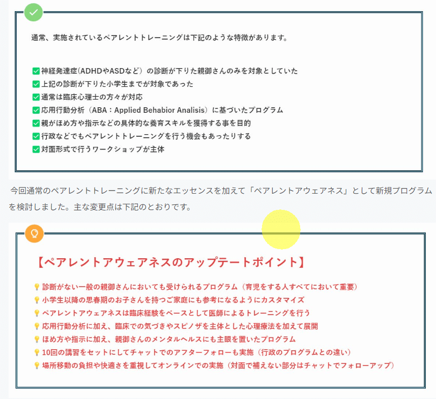 本来は神経発達症(ADHDやASDやLDなど)を持つ親御さん向けのプログラムとして、クリニックや専門機関の臨床心理士の方々が行うプログラムとして行われていたグループセッションでもあります。一種の認知行動療法も含むようなプログラムとなっており、神経発達症を有するお子さんを養育する親御さんへのサポートプログラムとして存在していました。